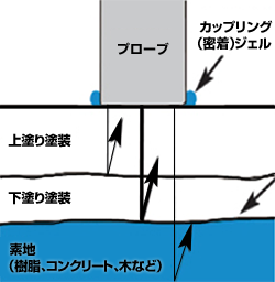 超音発信素子から発せられた超音波パルスは、塗膜上に塗られたジェルを通してコーティング層内を進み、密度で異なる層の境界で反射します。 コーティング膜と素地との界面あるいは塗膜の層間から反射してくる超音波の到達時間を分析することで膜厚が測定されます。 反射して戻ってくるまでの時間は、境界までの厚み(プローブからの距離)の違いにより2つないし複数に分かれます。条件によっては多層膜の各層の厚みも測定することができます。