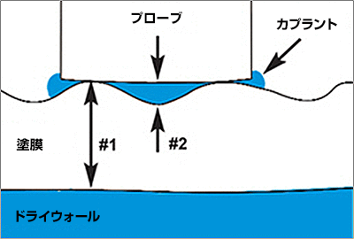 塗膜表面に凸凹模様ある表面や粗い表面では、ポジテクター200は通常、塗膜の山の頂上から下地までの塗膜の厚さを特定して表示します。これは、図の距離#1となります。