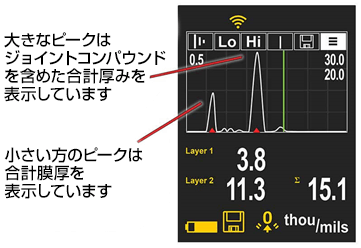 合計膜厚を測定しているときに、ドライウォールの継ぎ目を覆っているジョイントコンパウンドの上に来ると、決まったように高い測定値が表示されることがあります。この場合、ジョイントコンパウンドの厚みも合計膜厚に含まれていると考えられます。これは、ジョイントコンパウンドとプライマーよりも、ドライウォールとジョイントコンパウンドの間に大きな密度差があるため、大きなエコーがそこから反射してくるためです。膜厚計の設定で2層測定に変更すると、右図に示すように、膜厚計は塗料の合計膜厚とジョイントコンパウンドの厚みを個別に識別します。